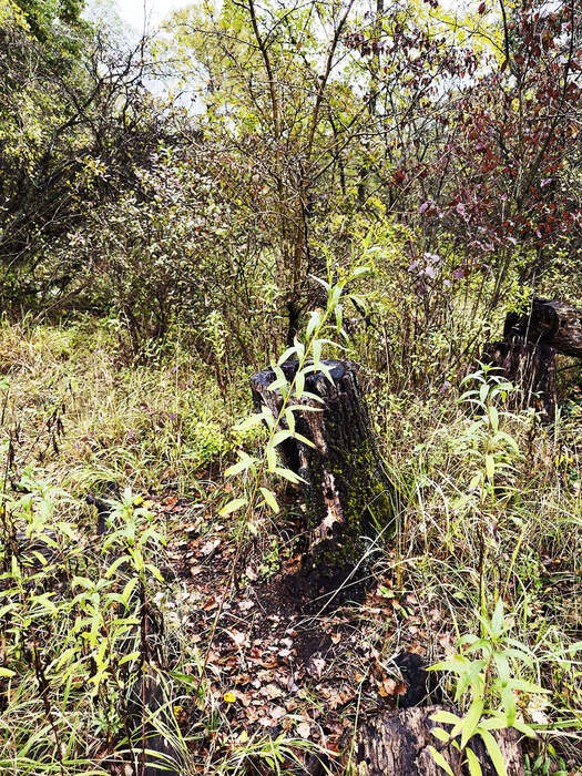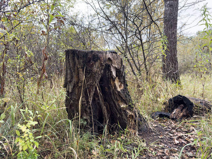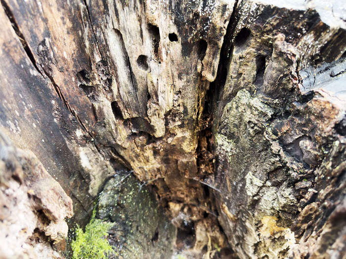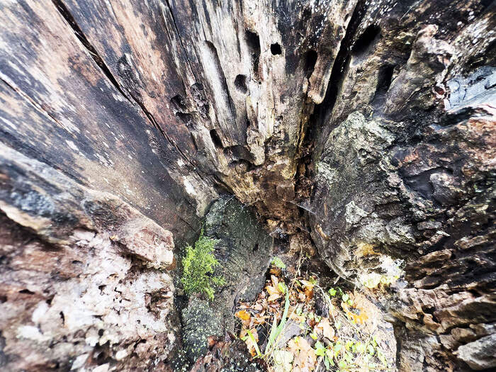 The decaying log creates a unique microclimate on the forest floor. Inside the log, the air is more humid, cool, and sheltered from extreme temperature changes, making it an ideal environment for the insects that inhabit it. This habitat offers protection from predators and the elements, while the decaying wood retains moisture that helps sustain a variety of fungi and other decomposers that thrive alongside the insects.