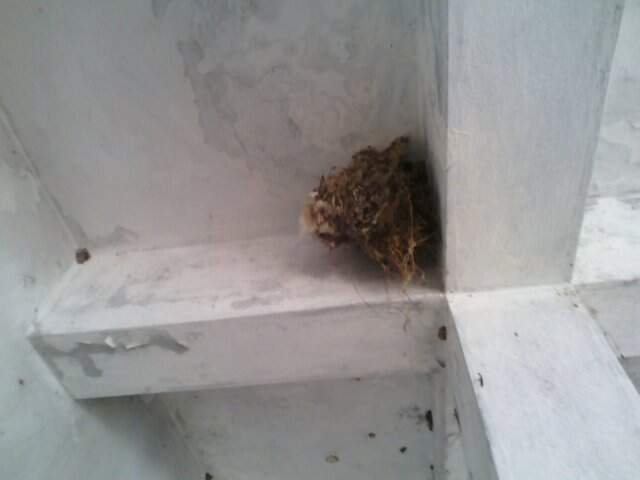 The nest is composed of softer materials, like feathers, to line the inside for comfort and insulation. The nest's placement in an indoor corner indicates that the bird had sought a safe, secluded spot away from exterior threats.