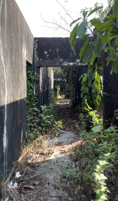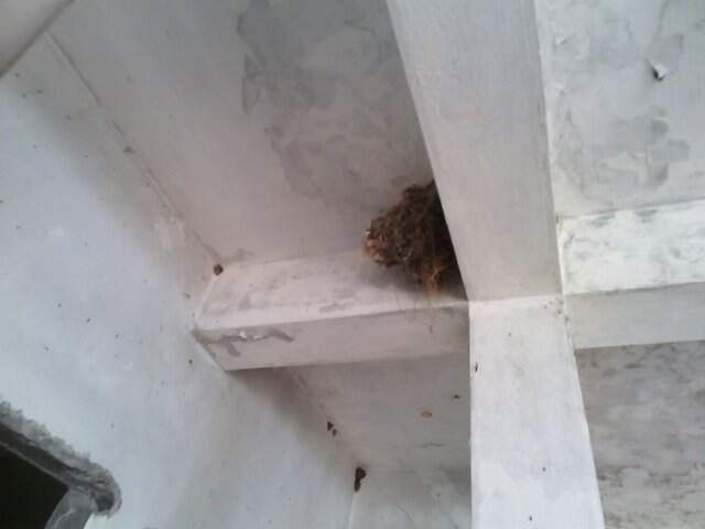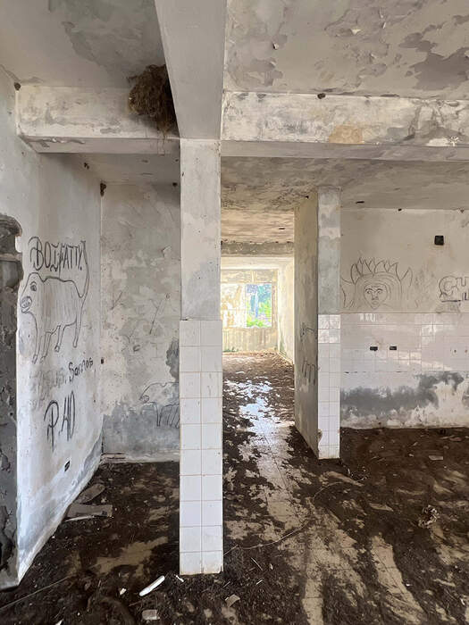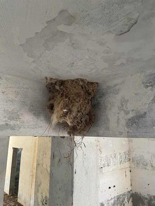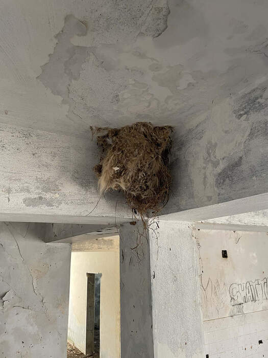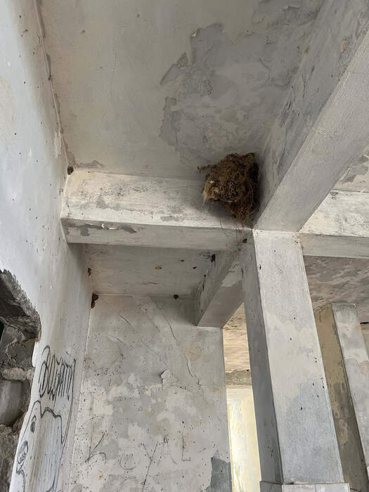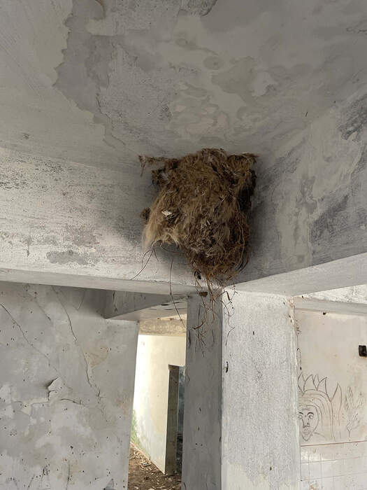 The nest is attached to the corner of an intersection point between two concrete supporting beams and a concrete column. This abandoned hotel had a capacity of about 50 rooms. All the valuable materials of the building had been removed and sold after the Second Civil War. The remaining structure has become home to many species, which we have scanned and documented.